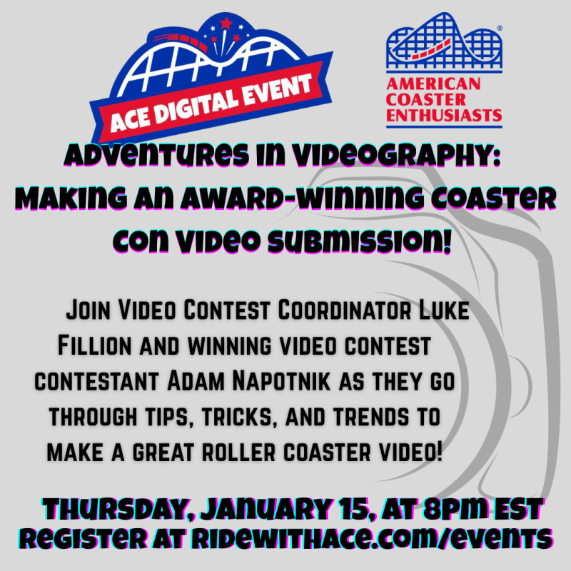 The Adventures in Videography ACE digital event on January 15 was hosted by the Coaster Con Video Contest Coordinator Luke Fillion, who has been a member of ACE for 18 years and has been coordinator of the contest beginning with Coaster Con 47 in 2025.