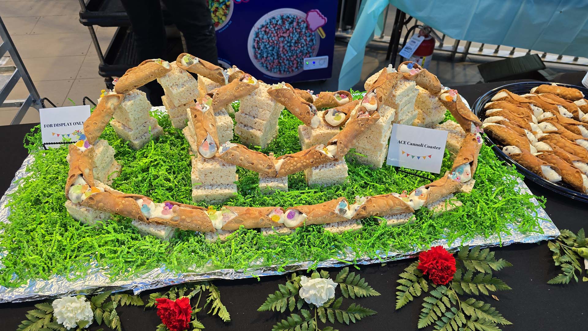 A dessert bar was decorated with a Rice Krispie treat-can-cannoli roller coaster.