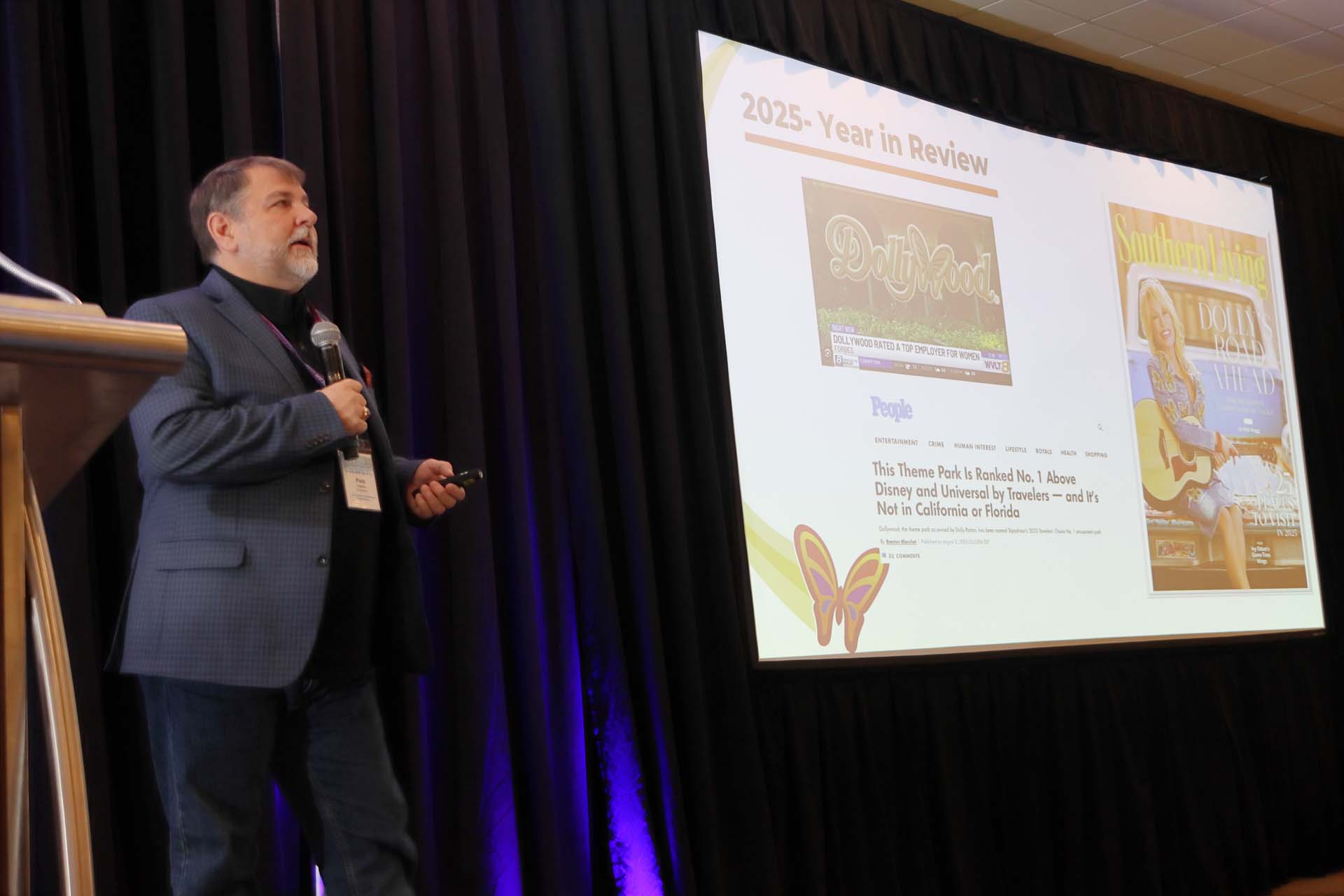 Vice President for Marketing and Public Relations Pete Owens, who is beginning his 27th season at Dollywood (Pigeon Forge, Tennessee), had news from Dollywood and the National Roller Coaster Museum and Archives (NRCMA). 2025 was Dollywood’s 40th season, and Owens reviewed the events of the year and the park’s successes. It won awards from Trip Advisor (No. 1 U.S. theme park), Forbes (top employer awards) and Newsweek Readers’ Choice (park attractions). In ride news, Blazing Fury received an upgrade.