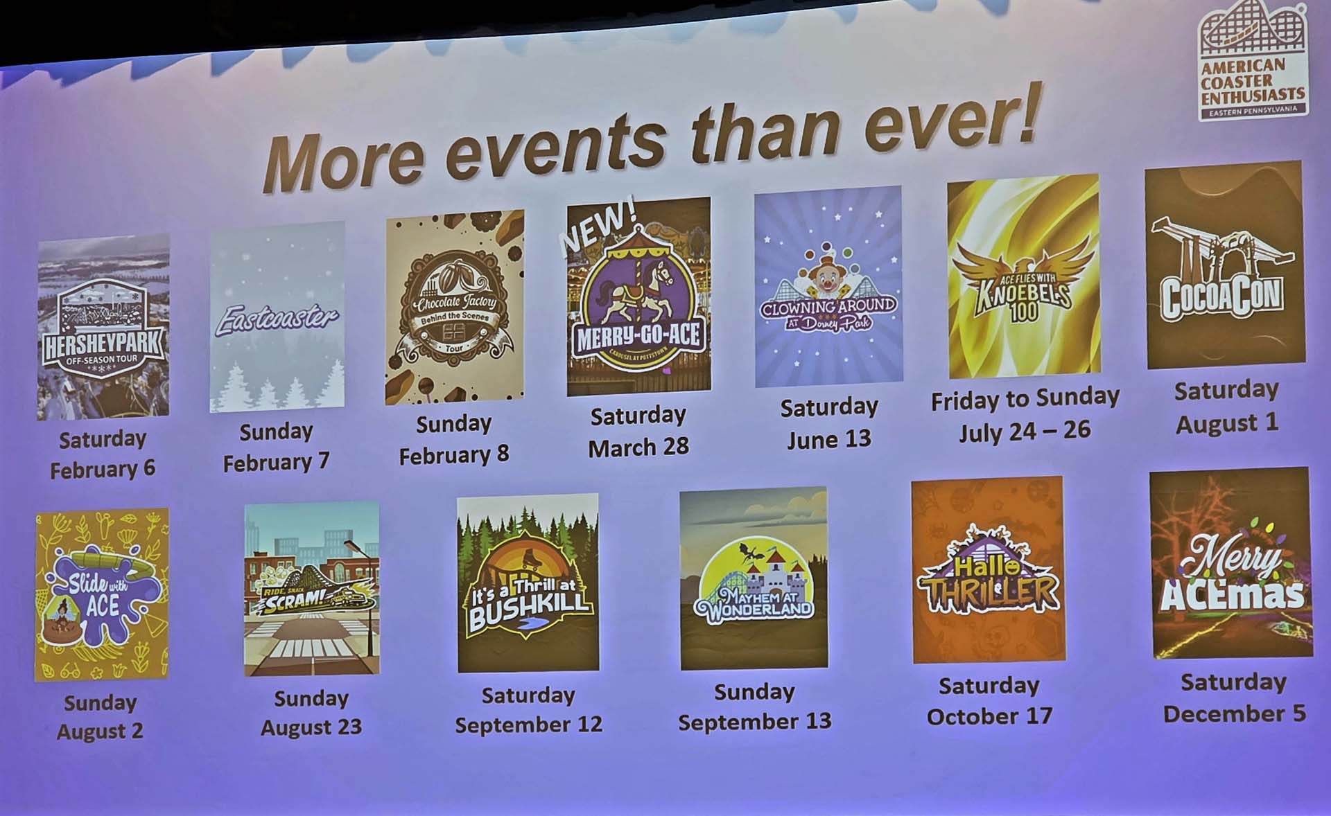 At 10, Regional Rep Mike Matscherz and assistant rep Derek Shaw welcomed everyone and announced that again this year, Philadelphia Toboggan Coasters, Inc. (PTCI) had agreed to sponsor Eastcoaster to reduce the cost for attendees. He listed Eastern Pennsylvania’s 11 events in 2025, mentioned the new regional T-shirt and announced 13 events for 2026: Hersheypark Off-Season Tour; Eastcoaster Chocolate Factory Behind the Scenes; Clowning Around at Dorney Park; ACE Flies With Knoebels 100; CocoaCon (Hersheypark); Slide With ACE (The Boardwalk at Hersheypark); Ride, Snack, Scram (Sesame Place); It’s a Thrill at Bushkill; Mayhem at Wonderland (Dutch Wonderland); HalloThriller (Dorney Park); and Merry ACEmas (Cointaker and Knoebels). The new event for 2026 is Merry-Go-ACE, which will take place at the historic Carousel in Pottsville, Pennsylvania, in March.