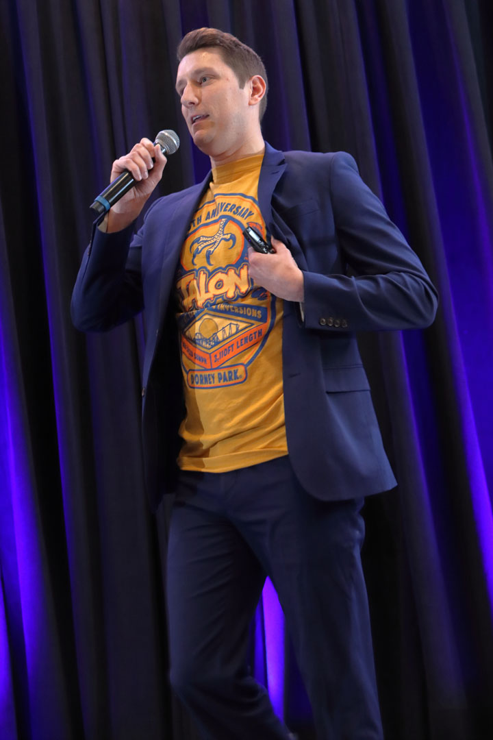 Vourderis ended with a message of hope — “liberty and justice for all” — and commented, “When things get tough, that’s what roller coasters are for.” He gave attendees $50 gift cards for use in the park and closed with a video, “How not to enjoy a ride.”