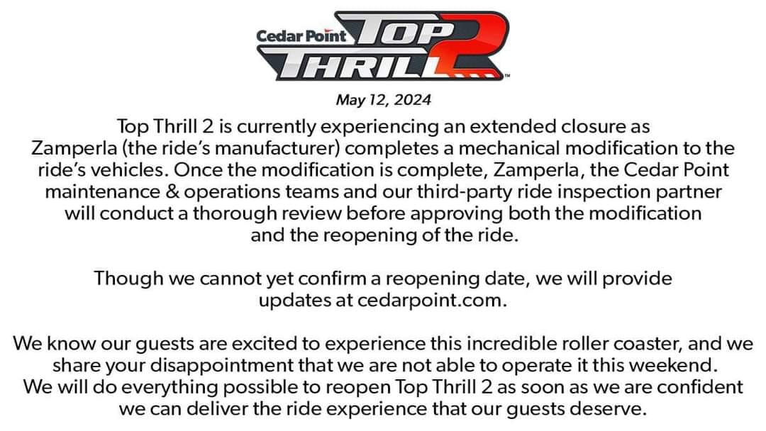 On March 12, Cedar Point, Sandusky, Ohio, posted the following message on Facebook: